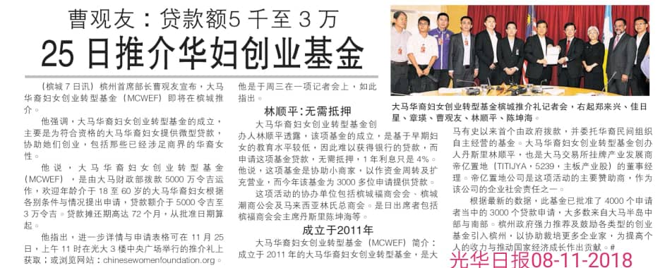 chinesewomenfoundation News & Events November 9, 2018 Launching Of Malaysian Chinese Women Entrepreneur Foundation for Penang state Date: 25-11-2018 (Sunday) Time: 11am Venue: Komtar Level 3, Concourse 光大三楼... Read More